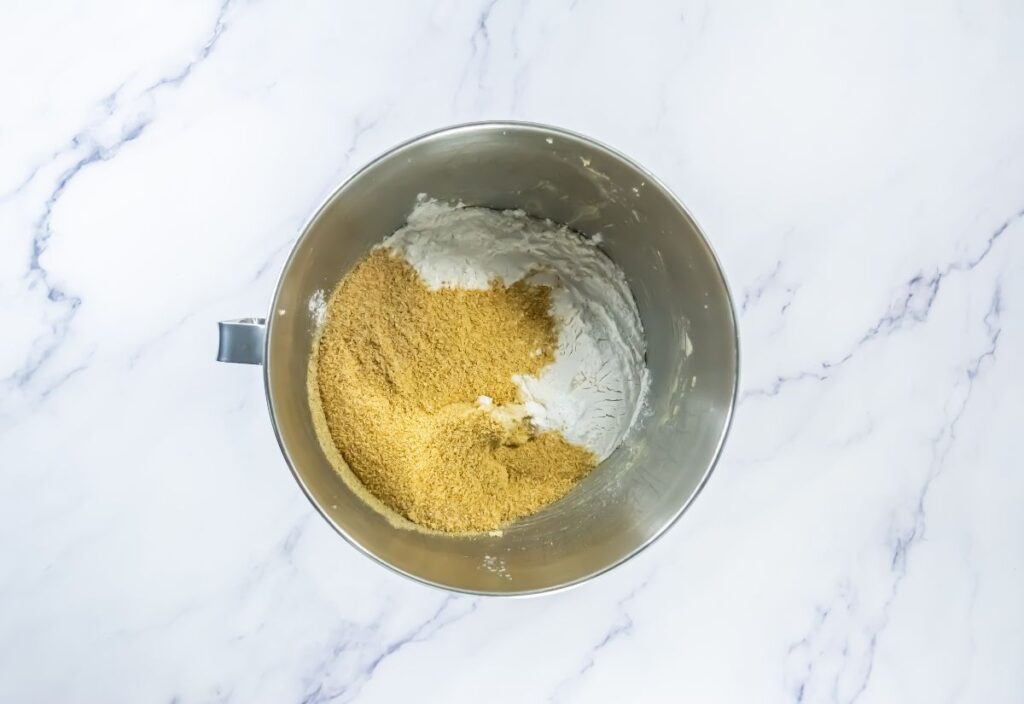 - Add the flour, 1 cup crushed graham crackers, salt, baking soda, and baking powder. Mix until the dough comes together, scraping the bowl as needed.