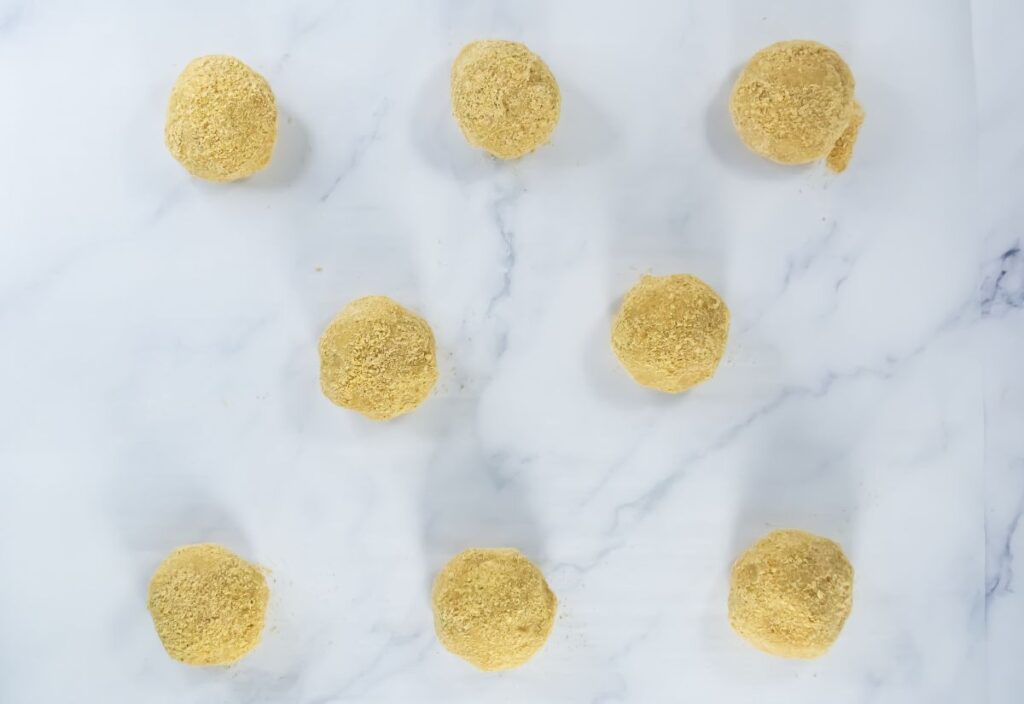- Scoop the dough with an ice cream scoop, then roll each ball in the remaining crushed graham crackers. Place them on the prepared baking sheets.