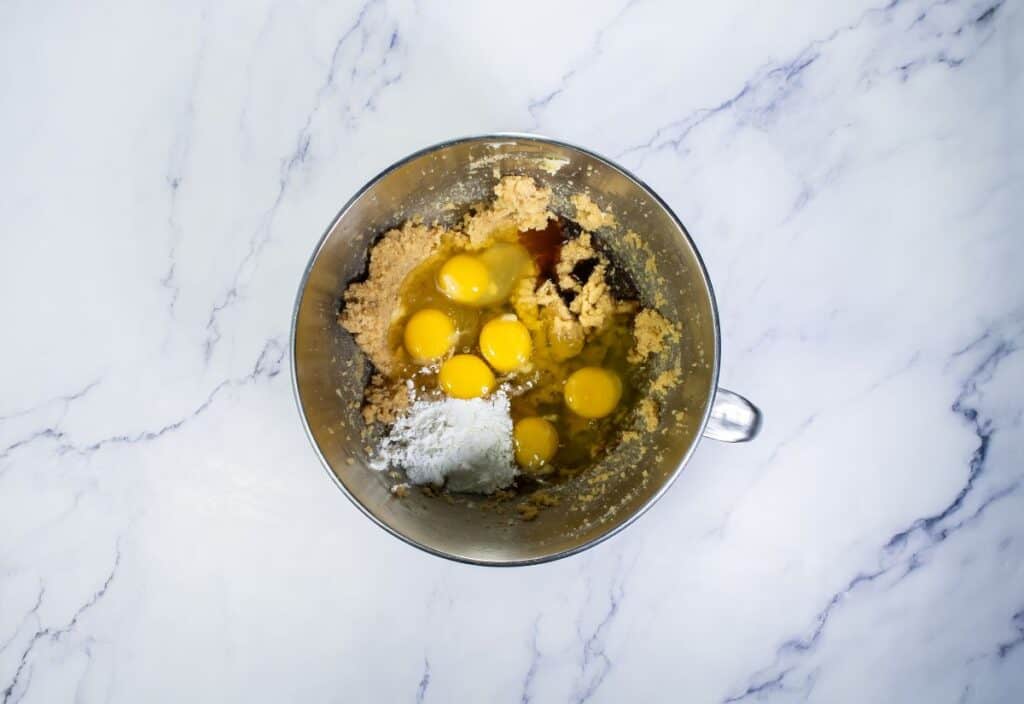 In the bowl of a stand mixer, blend the softened butter and brown sugar until creamy. I love using the mixer here because it incorporates air quickly for a smooth filling. Add the eggs, vanilla, corn syrup, corn starch, and bourbon if you are using it. Let the mixer run until everything is fully combined, scraping the sides of the bowl as needed so no pockets of sugar remain.
