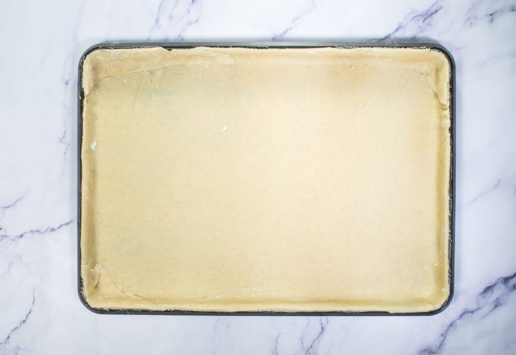 - Roll stacked pie crusts into a 15 by 20 inch rectangle and press into the baking sheet. Trim edges as needed.
