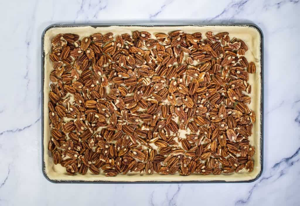 Scatter the pecan halves across the bottom of the crust. This keeps them from floating and ensures even bites in every square.