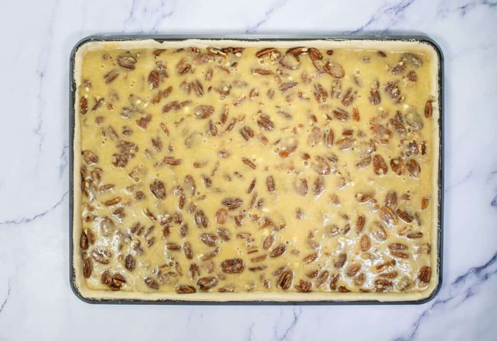 Pour the filling evenly over the pecans. Use a rubber spatula to guide the mixture into the corners if needed. The spatula helps you spread without tearing the crust.