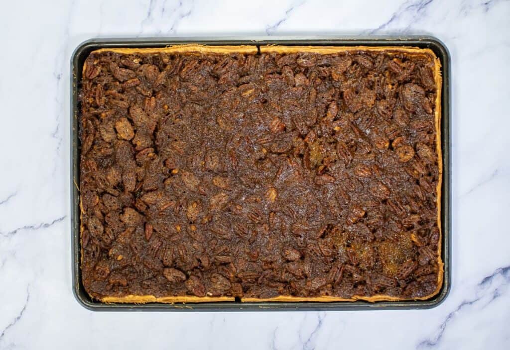 - Pour filling over pecans and bake 50 to 60 minutes until set. Cool before slicing.